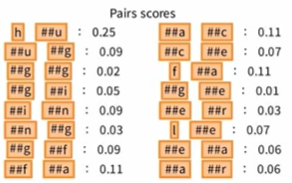 compute pair score (h, ##u) : $score = \frac{\textrm{freq of pair}}{\textrm{freq of first element} \times \textrm{freq of second element}} = \frac{4}{4 \times 4} = 0.25$