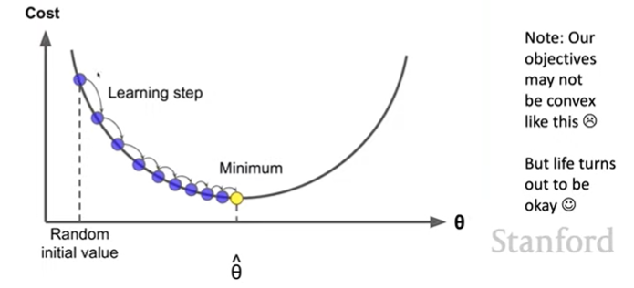 - Update Equation : $\theta^{new} = \theta^{old} - \alpha \nabla_\theta J(\theta)$, for $\alpha$ = step size or learning rate.