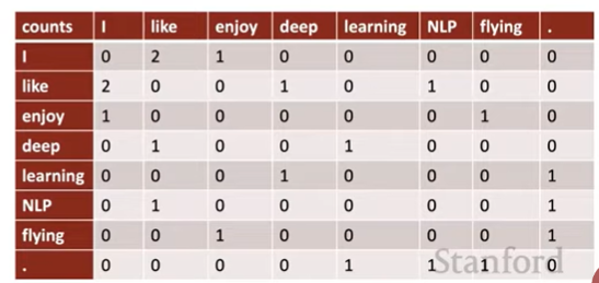 - I like deep learning, I like NLP, I enjoy flying이라는 corpus가 존재할 때, window length = 1인 co-occurence matrix는 다음과 같다. 또한 단어 등장 순서와 관계없이 구성하므로 symmetric하다.