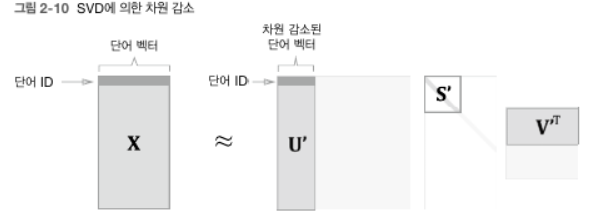 $\mathbf{X} = \mathbf{USV}^T$ where $\mathbf{U}, \mathbf{V}$ : 직교행렬(Orthgonal matrix)이며, 그 열벡터는 서로 직교한다. $\mathbf{S}$ : 대각행렬(Diagonal matrix) - 직교행렬 $\mathbf{U}$는 단어 공간의 축(기저)을 형성한다. $\mathbf{S}$ 대각행렬의 대각성분에는 특잇값(singular value)이 큰 순서대로 나열되어있다. 따라서 중요도가 높은 원소들을 남김으로써 차원 축소가 가능하다.