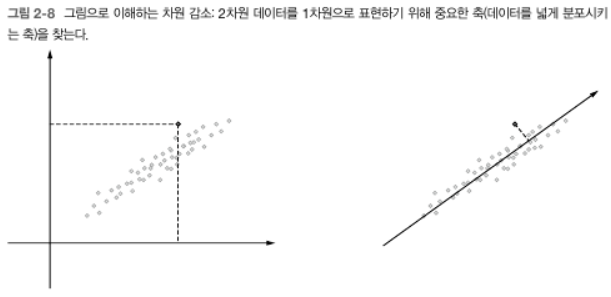 - '중요한 정보'는 최대한 유지하면서 벡터의 차원을 줄이는 방법. 직관적으로, 다음 그림처럼 데이터의 분포를 고려해, 데이터의 설명력을 가장 잘 보존하는 "축"을 찾는 일을 수행한다.