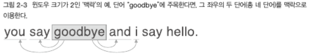 - 맥락(context) : 특정 단어를 중심에 둔 주변 단어. 윈도우(Window)는 맥락의 크기를 의미한다. 즉 window=2면 좌우의 2개 단어, 총 4개가 맥락에 포함됨.
