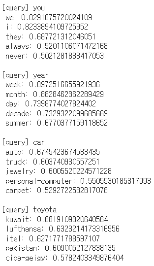 - 결과 상 "you" 검색어에 대해 인칭대명사 "we", "i"가 상위를 차지한다. 또 "year"의 연관어로는 "week"과 "month"가, "car"의 연관어로는 "auto"와 "truck" 등이 뽑힌다. 이처럼 단어의 의미, 문법적인 관점에서 비슷한 단어들이 가까운 벡터로 나타났다.