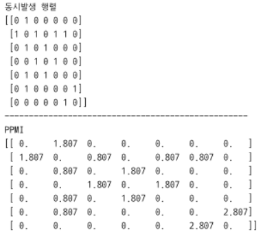 - 동시발생 행렬 : "발생" 횟수라는 것은 사실 그리 좋은 특징이 아니다. 예를 들면, "the"와 "car"라는 단어의 동시발생을 생각해 보자. "car"와 "drive"가 매우 관련이 깊음에도 불구하고 단순히 등장 횟수만 본다면 "the"가 고빈도 단어이기 때문에 "car"는 "the"와의 관련성이 더 강하다고 나올 것이다.