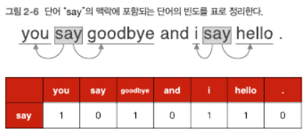 - 통계 기반 기법은 말뭉치 안의 각 단어에 대해서 그 단어의 주변 단어의 빈도를 집계한다(동시 발생 행렬)