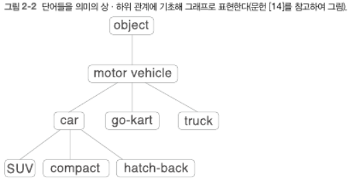 - 단어 사이의 '상위와 하위', '전체와 부분' 등 더 세세한 관계까지 정의해 둔 경우가 많음.