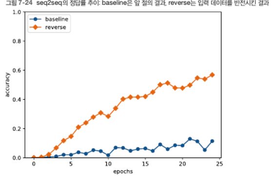 - 예를 들면 '나는 고양이로소이다' -> 'I am a cat' 번역 문제에서 '나' -> 'I'로 변환하려면 '는', '고양이', '로소', '이다'까지 총 4 단어 분량의 LSTM 계층을 거쳐야 한다. 따라서 역전파 시 'I'에서 전해지는 기울기가 그 먼 거리만큼 영향을 받는다. 여기에서 입력문을 반전시키면, '이다 로소 고양이 는' 순이 되면 '나'와 'I'가 바로 옆에 위치해 기울기를 직접 전달할 수 있다.