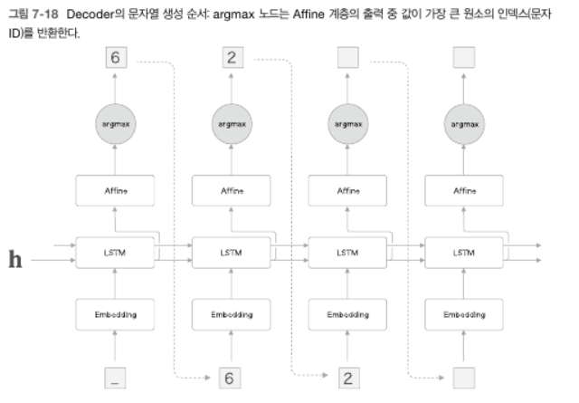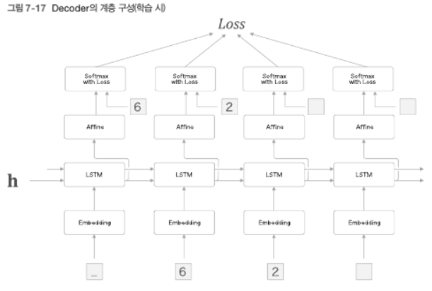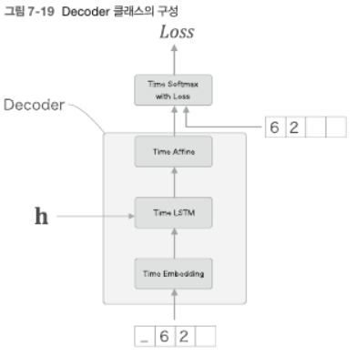 - Decoder는 벡터 $\mathbf{h}$를 입력으로 받는다는 점 외에는 앞 절 신경망과 완전히 같은 구성이다. 참고로, 앞 절의 언어모델에서는 LSTM 계층이 아무것도 받지 않았다.