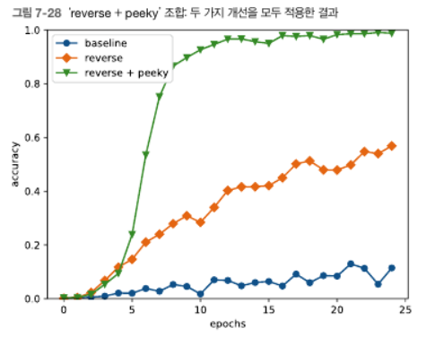 - 앞선 덧셈 문제 풀이를 PeekySeq2seq 모델을 사용하고, 첫번째 개선인 Reverse(입력 반전)도 적용하면 다음과 같이 정확도에서의 큰 개선을 확인할 수 있다 :