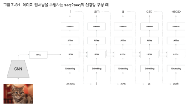 - 다만 이미지 feature map은 3차원이기 때문에 1차원으로 flatten 시킨 후 Affine 계층에서 LSTM이 처리할 수 있는 형태로 손질한다.