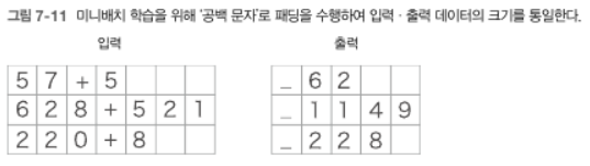 - '덧셈'을 문자(숫자)의 리스트로써 다루게 되면 각 예시들의 문자 수가 문제마다 달라진다. 이런 '가변 길이 시계열 데이터'를 다룰 때 신경망 학습 시에 '미니배치 처리'를 하기 위해서 추가적인 작업이 필요하다.