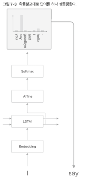 - 문장을 생성할 때는 하나의 단어(혹은 문자)를 주고 모델의 출력(확률분포)에서 샘플링하는 과정을 반복한다.