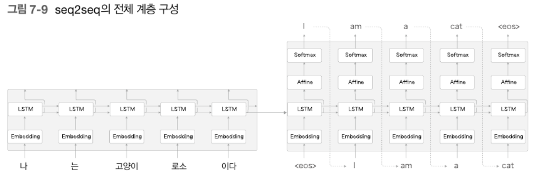 - 다음은 Decoder와 Encoder를 연결한 계층 구성이다. seq2seq는 LSTM 두 개(Encoder의 LSTM, Decoder의 LSTM)로 구성된다. 이때 LSTM 계층의 은닉 상태가 Encoder와 Decoder를 이어주는 '가교'가 된다. 순전파 때는 Encoder에 인코딩 된 정보가 LSTM 계층의 은닉 상태를 통해 Decoder에 전해진다. 그리고 seq2seq의 역전파 때는 이 '가교'를 통해 Decoder로부터 Encoder로 전해진다.