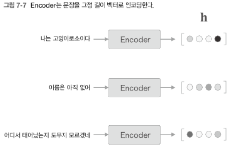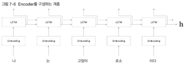 - Encoder의 최종 출력 벡터 $\mathbf{h}$는 LSTM 계층의 마지막 은닉 상태이다. 이 마지막 은닉 상태에 입력 문장(출발어)을 번역하는데 필요한 정보가 인코딩된다. 여기서 중요한 점은 LSTM의 은닉 상태 $\mathbf{h}$는 고정 길이 벡터라는 사실이다. 따라서 "인코딩" = 임의 길이 문장을 고정 길이 벡터로 변환하는 작업이 된다.