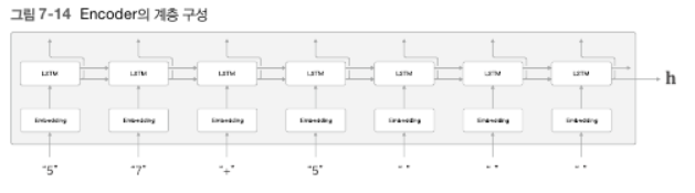 - Encoder class는 문자열 ["5", "7", "+", "5", "", "", ""]를 입력으로 받아 벡터 $\mathbf{h}$로 변환한다. Encoder 클래스는 Embedding 계층과 LSTM 계층으로 구성되어있다. Embedding 계층에서는 문자ID를 문자 벡터로 변환하며 이 벡터가 LSTM 계층으로 입력된다.