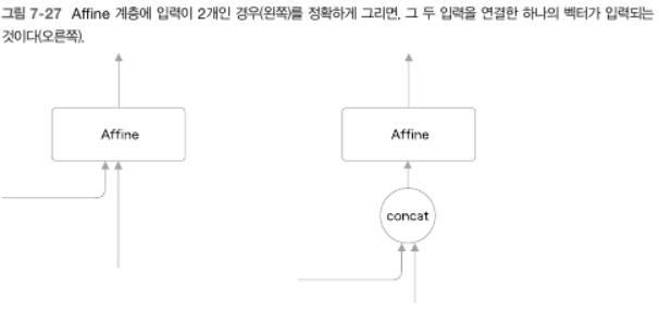 - 그런데 그림에서 이제 LSTM 계층과 Affine 계층에 입력되는 벡터가 2개씩이 되었다. 이는 실제로는 두 벡터가 연결(concatenate) 된 것을 의미하며 따라서 두 벡터를 연결하는 concat 노드를 이용해 그리면 다음과 같이 최종적인 구조도를 그릴 수 있다.
