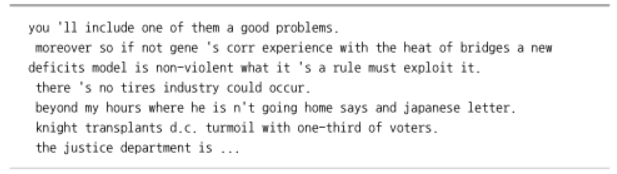 - model.predict(x), p = softmax(score)를 통해 정규화된 확률분포 p를 얻을 수 있으며 이로부터 다음 단어를 샘플링한다. 가중치 매개변수가 무작위 초깃값인 상태에서(학습 X 상태에서) "you" 단어로부터 시작해서 문장을 생성하면 엉터리로 단어들을 나열한 글을 출력한다. 반면, 학습을 수행한 언어모델을 활용하면 다음과 같은 문장을 생성할 수 있다 :