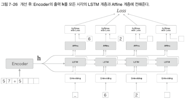 - 이렇게 모든 시각의 Affine 계층과 LSTM 계층에 Encoder의 출력 $\mathbf{h}$를 전해주면 정보를 공유하는 효과가 있어 더 올바른 결정을 내릴 가능성이 커진다.