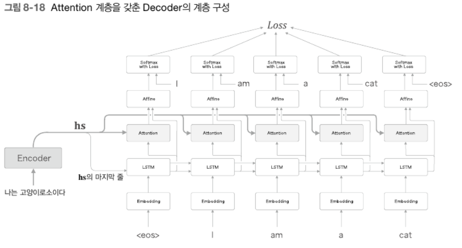 - 구현 관점에서는 LSTM 계층과 Affine 계층 사이에 Attention 계층을 삽입하는 쪽이 더 쉽다. 또한 이 경우 Decoder의 데이터 흐름이 아래에서 위로 가는 한 방향이기 때문에 Attention 계층을 쉽게 모듈화할 수 있다.