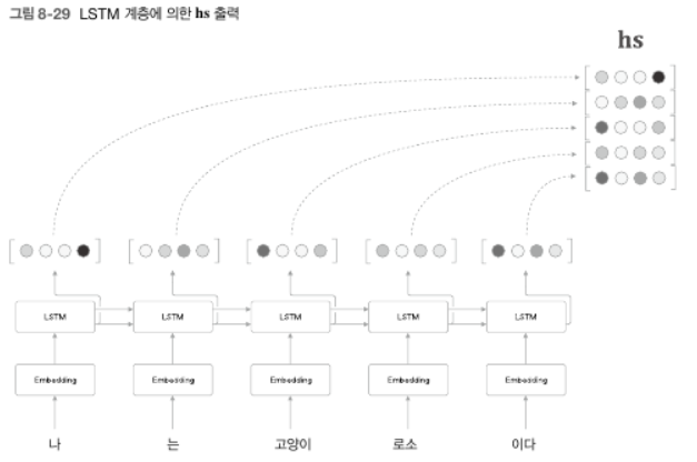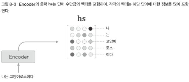 - 그렇다면 시각별 LSTM 계층의 은닉 상태에는 직전에 입력된 단어에 대한 정보가 많이 포함되어있을 것이다. ex) 고양이 단어를 입력했을 때의 LSTM 계층의 출력(은닉 상태)은 직전에 입력한 '고양이'라는 단어의 영향을 가장 크게 받는다는 것이다. 즉, '고양이'의 '성분'이 많이 들어간 은닉 상태 벡터를 얻게 되며 Encoder가 출력하는 $\mathbf{hs}$ 행렬은 각 단어에 해당하는 벡터들의 집합이라 볼 수 있다.
