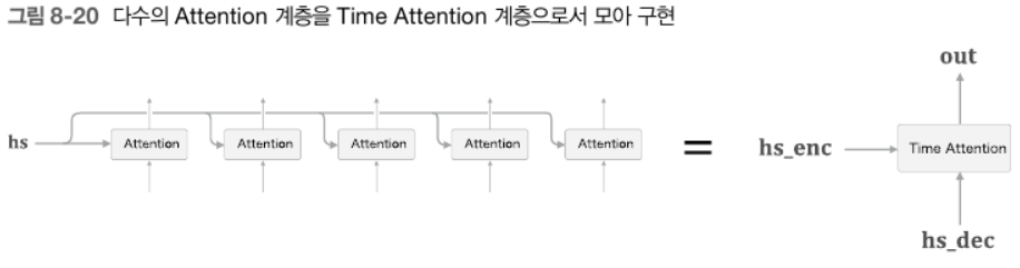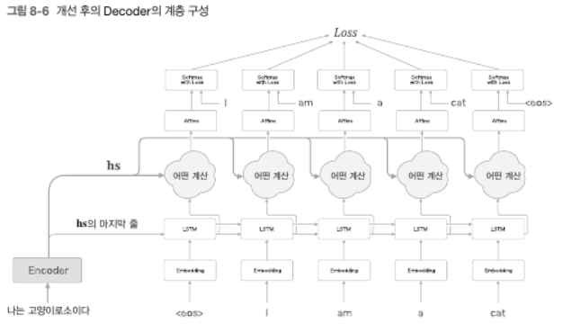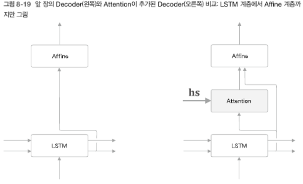 - [그림 8-6]에 추가된 '어떤 계산'은 Encoder로부터 $\mathbf{hs}$와 시각별 LSTM 계층의 은닉상태 2가지를 입력으로 받는다. 여기에서 필요한 정보만 골라 위쪽의 Affine 계층으로 출력한다.
