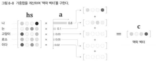 - $\mathbf{a}$는 확률분포처럼 각 원소가 0~1.0 사이의 scalar이며 총합은 1이 된다. 이 $\mathbf{a}$와 $\mathbf{hs}$의 가중합을 '$\mathbf{c}$ = 맥락 벡터(context vector)'라 한다. 그림에서는 현재 '나'에 해당하는 가중치가 0.8이기 때문에 맥락 벡터에는 '나' 벡터의 성분이 많이 포함되어있음을 의미한다. 즉, '나' 벡터를 선택하는 작업을 이 가중합으로 대체하고 있다.