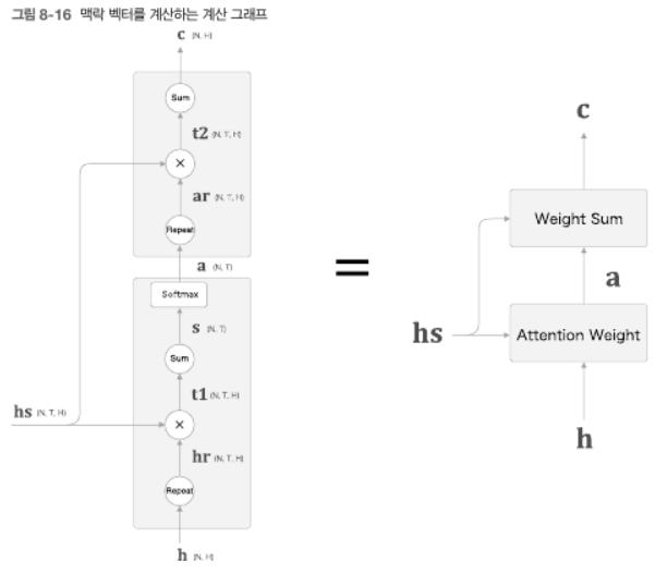 - 지금까지 (1) Attention Weight 계층, (2) Weight Sum 계층을 각각 구현했다. 이제 이 계층을 하나로 결합해보자.