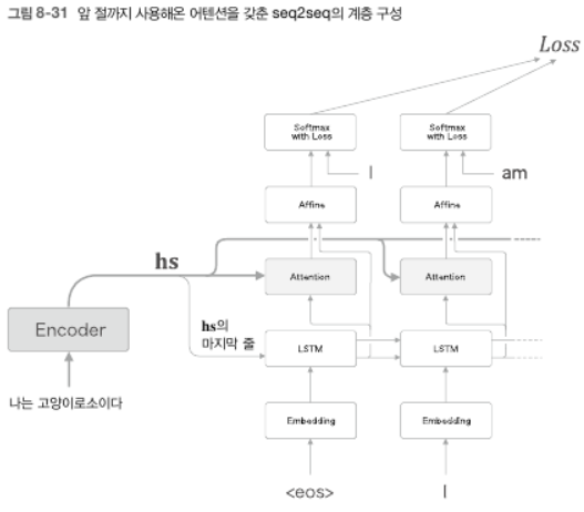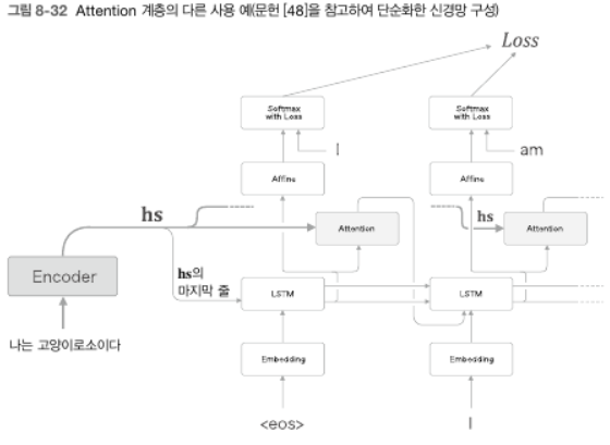 - 복습 : LSTM과 Affine 계층 사이에 Attention 계층을 삽입했다. 하지만 반드시 이 위치일 필요는 없다.