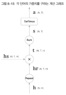 - 이처럼 Repeat 노드, 원소별 곱 x 노드, Sum 노드, Softmax 계층으로 구성된다.