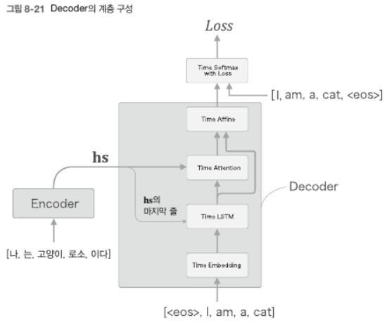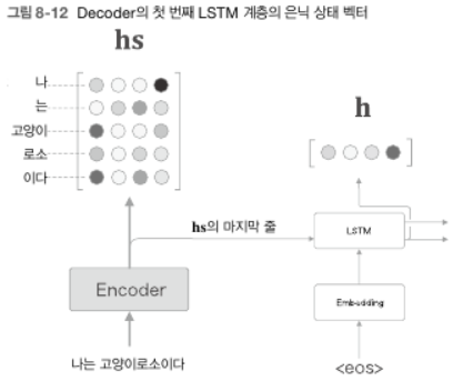 - Encoder LSTM 계층의 은닉 상태 벡터인 $\mathbf{hs}$가 Decoder에 전달되어 시계열 변환이 이루어진다.