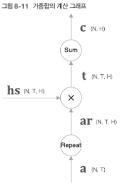 - 시계열의 길이 = T, 은닉 상태 벡터의 원소 수 H = 4 가중합을 구하는 과정이 위와 같다.