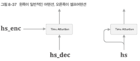 - 지금까지 시계열 데이터에서는 2개의 시계열 데이터 사이의 대응 관계를 구해왔다. Time Attention 계층에서는 그림 8-37의 왼쪽처럼 서로 다른 두 시계열 데이터가 입력된다. 반면, Self Attention은 오른쪽처럼 두 입력선이 모두 하나의 시계열 데이터로부터 나온다. 이러면 하나의 시계열 데이터 내에서의 원소 간 대응관계가 구해진다.