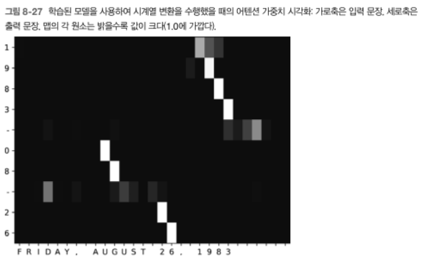 - seq2seq 시계열 변환을 할 때 어텐션 가중치를 시각화하면 다음과 같다. seq2seq가 최초의 "1"을 출력할 때는 입력 문장의 "1" 위치에 표시가 된다. 결과 그래프를 자세히 보면, 세로축(출력)의 "1983"과 "26"이 가로축(입력)의 "1983"과 "26"에 대응되고 있다. 더욱이, 월을 뜻하는 "08"에 입력 문장의 "AUGUST"가 대응하고 있다. 즉, seq2seq는 "August"가 "8월"에 대응된다는 사실을 데이터만 가지고 학습해 낸 것이다.