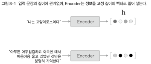 - seq2seq에서는 Encoder가 시계열 데이터를 인코딩해 Decoder로 그 정보를 전달한다. 이때 Endoer의 출력은 '고정 길이의 벡터' 이다. 고정 길이 벡터는 문장이 아무리 길어도 동일한 길이의 벡터로 변환된다는 뜻이다. 이 경우 필요한 정보가 벡터에 다 담기지 못할 가능성도 있다.