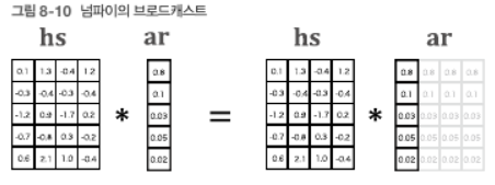 - a.reshape.repeat() 외에 넘파이의 브로드캐스트를 사용해도 동일한 결과를 얻을 수 있다. (ar = a.reshape(5, 1) 이후 hs * ar) 이 작업은 Repeat 노드이기 대문에 역전파 시 Repeat 노드의 역전파를 수행해야 한다.