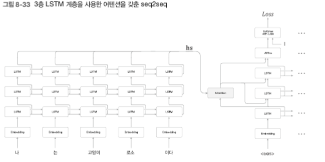 - attention이 추가된 seq2seq이 더 높은 표현력을 갖게 하기 위해 RNN(or LSTM) 계층을 더 깊게 쌓는 방법을 고려할 수 있다.