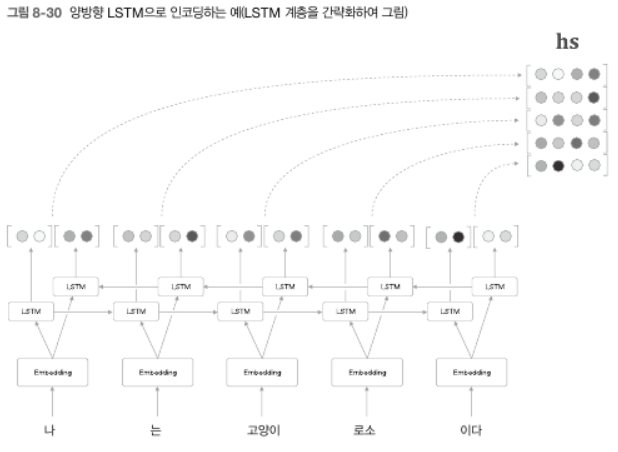 - LSTM의 각 시각의 은닉 상태는 $\mathbf{hs}$로 모아진다. Encoder가 출력하는 $\mathbf{hs}$의 각 행에는 그 행에 대응하는 단어의 성분이 많이 포함되어있다. 하지만 우리는 글을 왼쪽 -> 오른쪽으로 읽기 때문에 '고양이' 벡터의 경우 '나', '는', '고양이' 까지 총 3 단어의 정보가 인코딩되어 들어간다. 전체적인 균형을 생각하면 '고양이' 단어의 주변 정보를 균형있게 담고자 한다.