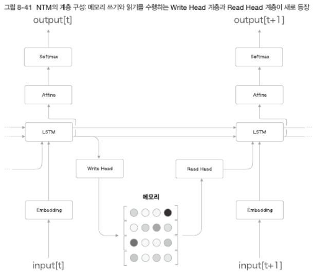 - 여기에서는 LSTM 계층이 '컨트롤러'가 되어 NTM의 주된 처리를 수행한다. 각 시각에서 LSTM 계층의 은닉 상태를 Write Head 계층이 받아 필요한 정보를 메모리에 쓰고 Read Head 계층이 메모리로부터 중요한 정보를 읽어들여 다음 시각의 LSTM 계층으로 전달한다.