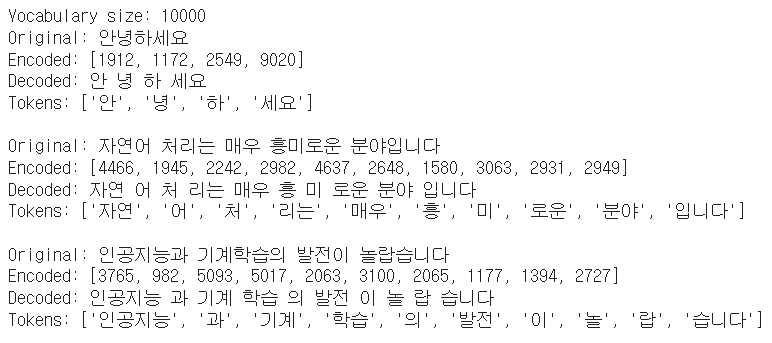 test_texts = ["안녕하세요", "자연어 처리는 매우 흥미로운 분야입니다", "인공지능과 기계학습의 발전이 놀랍습니다"]