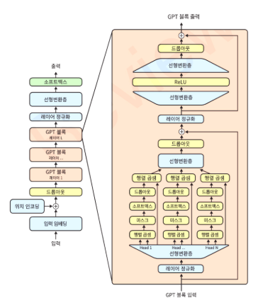 - 각 블록 내에서는 주로 어텐션 메커니즘과 피드포워드 네트워크가 수행되어 입력데이터로부터 더 복잡하고 추상적인 특징을 추출함. 이 구조를 통해 모델의 깊이와 복잡성을 조잘할 수 있으며 필요에 따라 블록을 추가하거나 구성을 변경해 성능 최적화가 가능함.