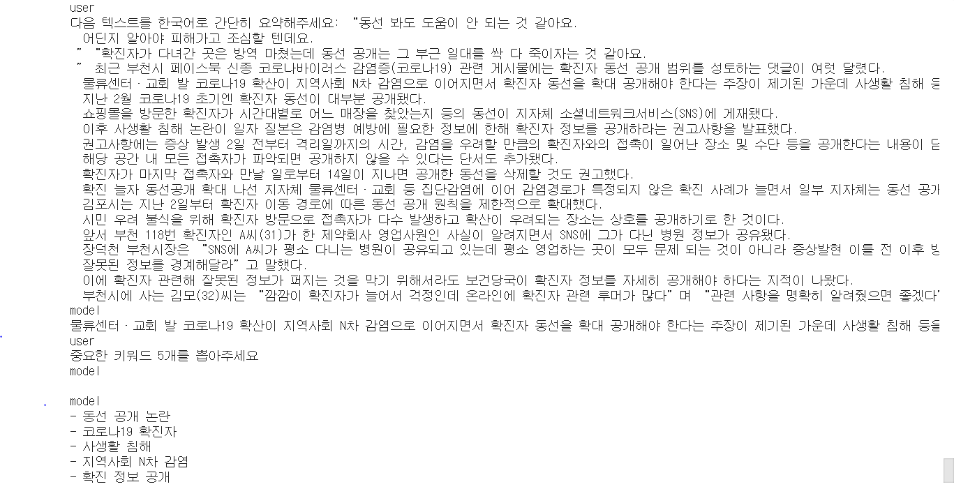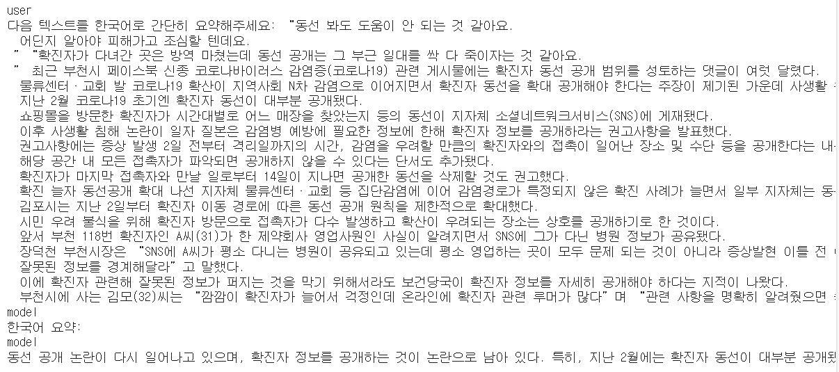- tokenizer.apply_chat_template 기능을 활용해 데이터를 대화 형식으로 바꿔 모델에 입력하게 됨. 키워드 추출 능력이 준수함을 확인할 수 있다.